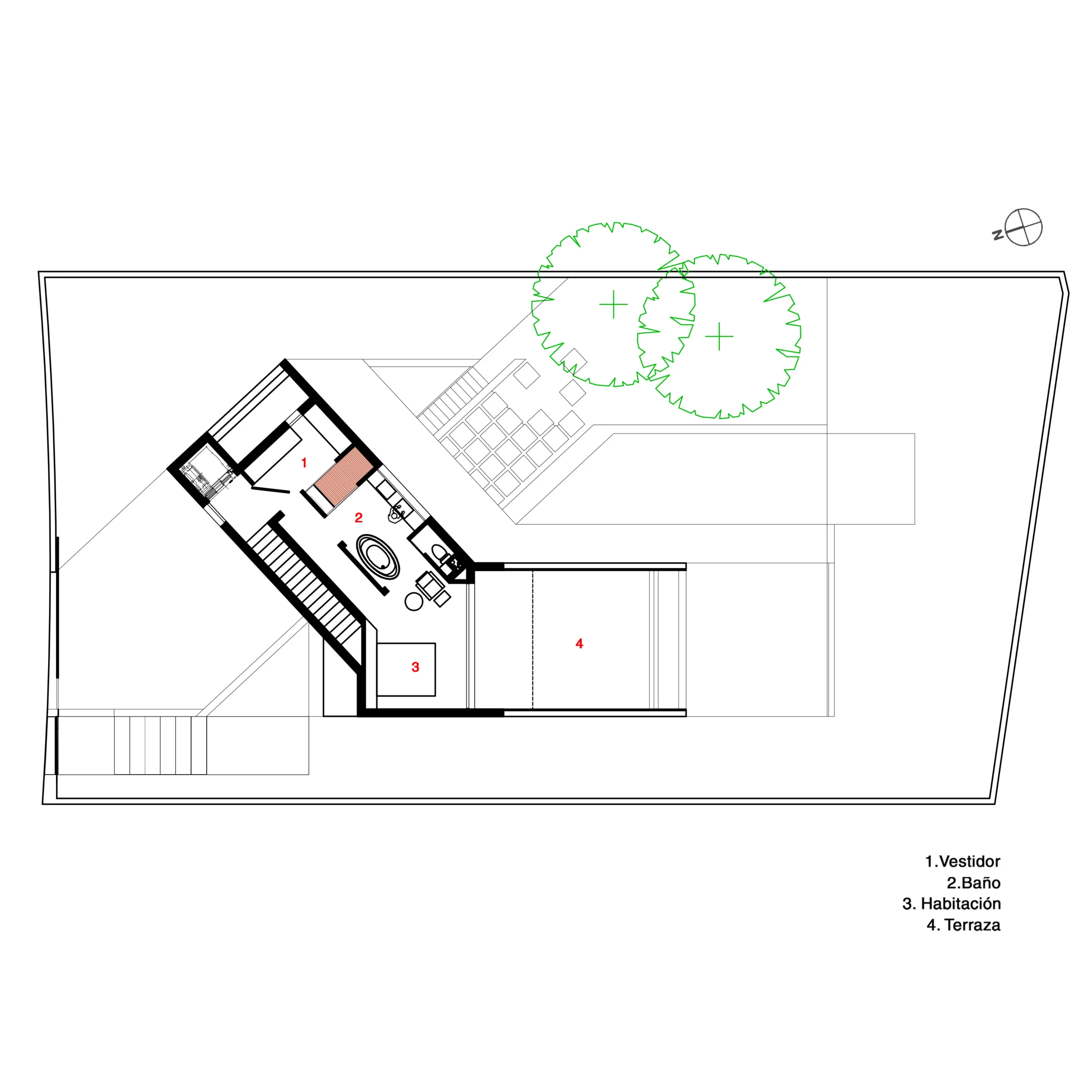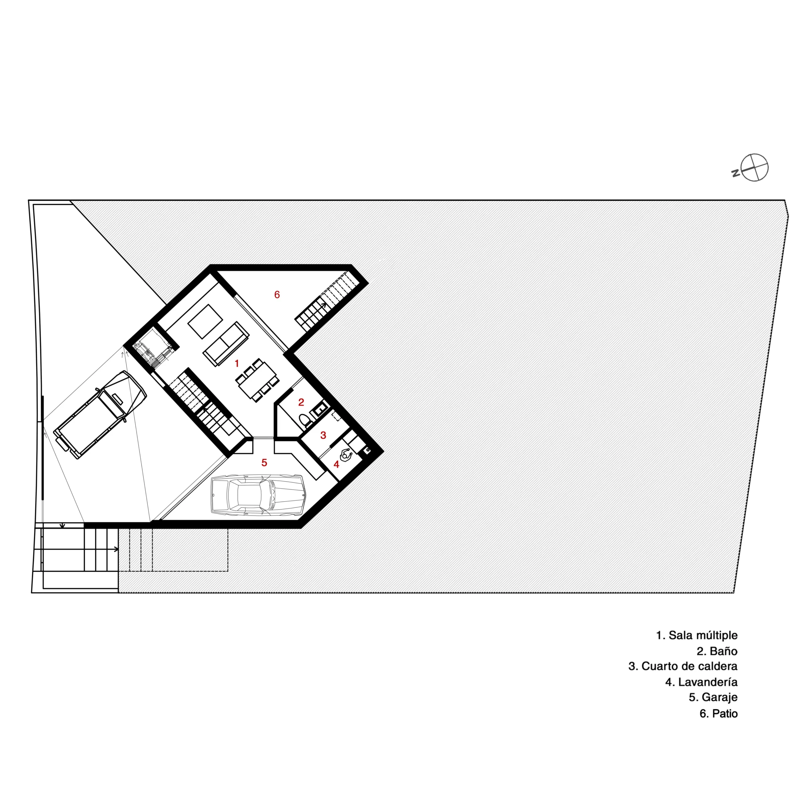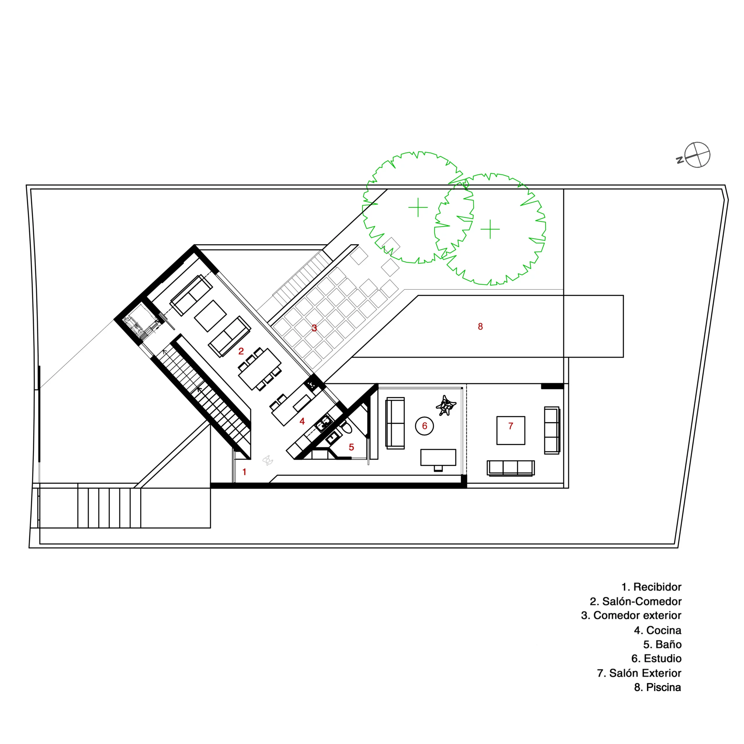 El semisótano aprovecha la pendiente y aloja una sala de televisión (con posibilidad de convertirse en habitación de invitados), zona de lavandería, cuarto de máquinas y un garaje. En la planta baja se ubica el salón-comedor, la cocina, un despacho y el jardín que cuenta con una zona de comedor exterior (anexo al salón-comedor), un salón exterior (conectado al despacho) y la piscina. En la planta piso está la habitación principal con un baño y un vestidor que se vincula visual y espacialmente y tienen comunicación con el exterior a través de una amplia terraza.
