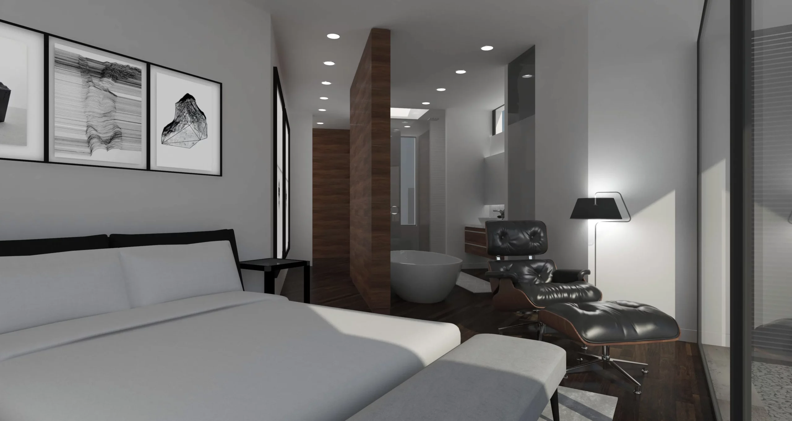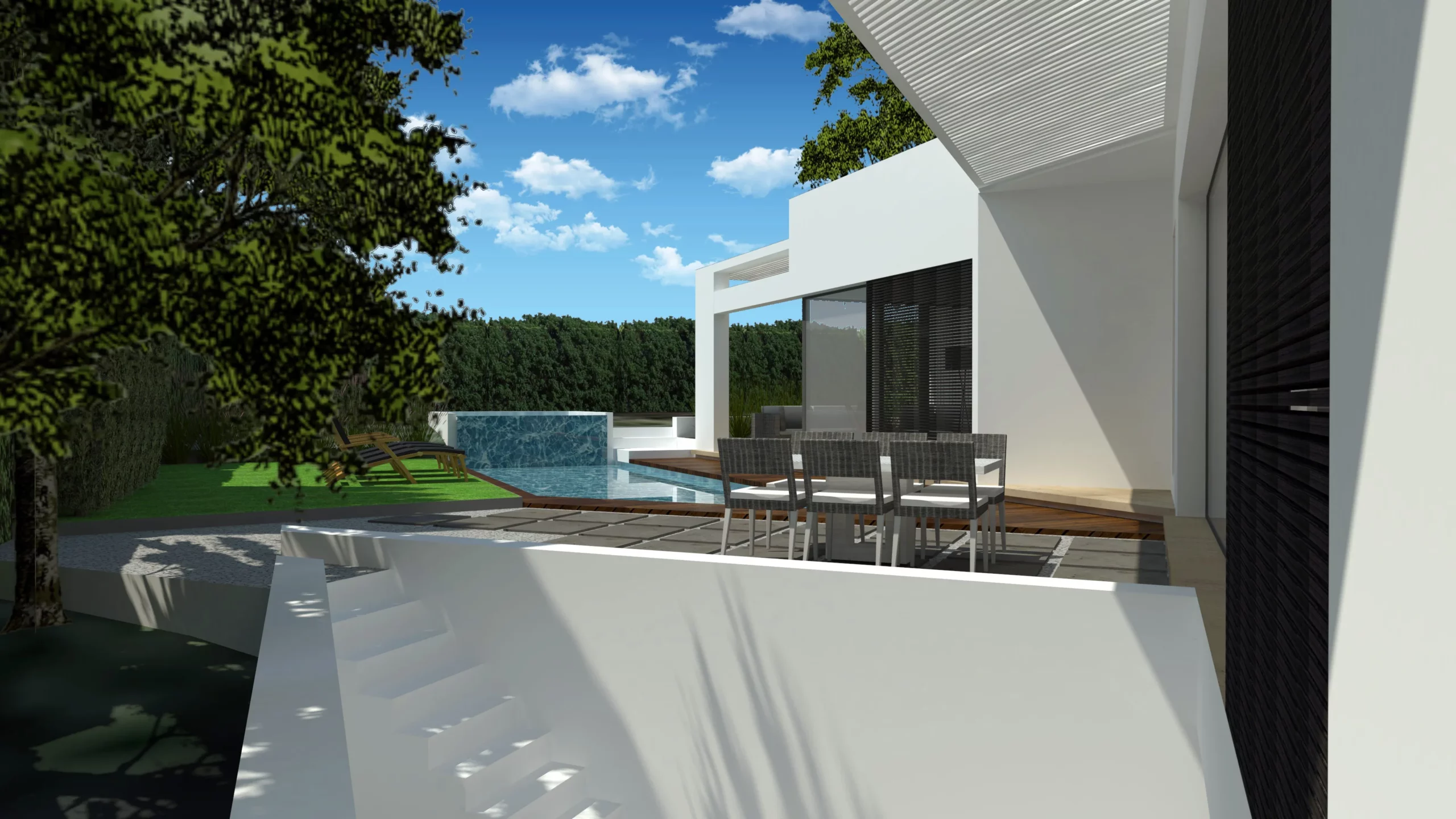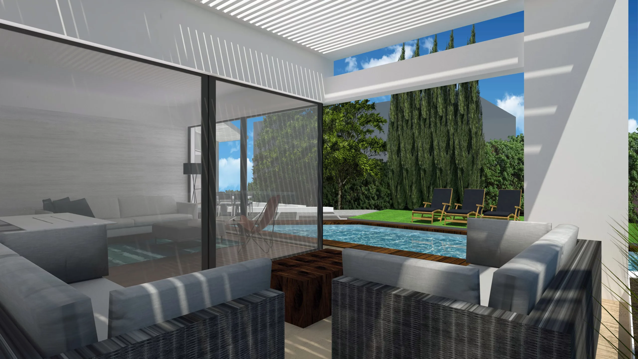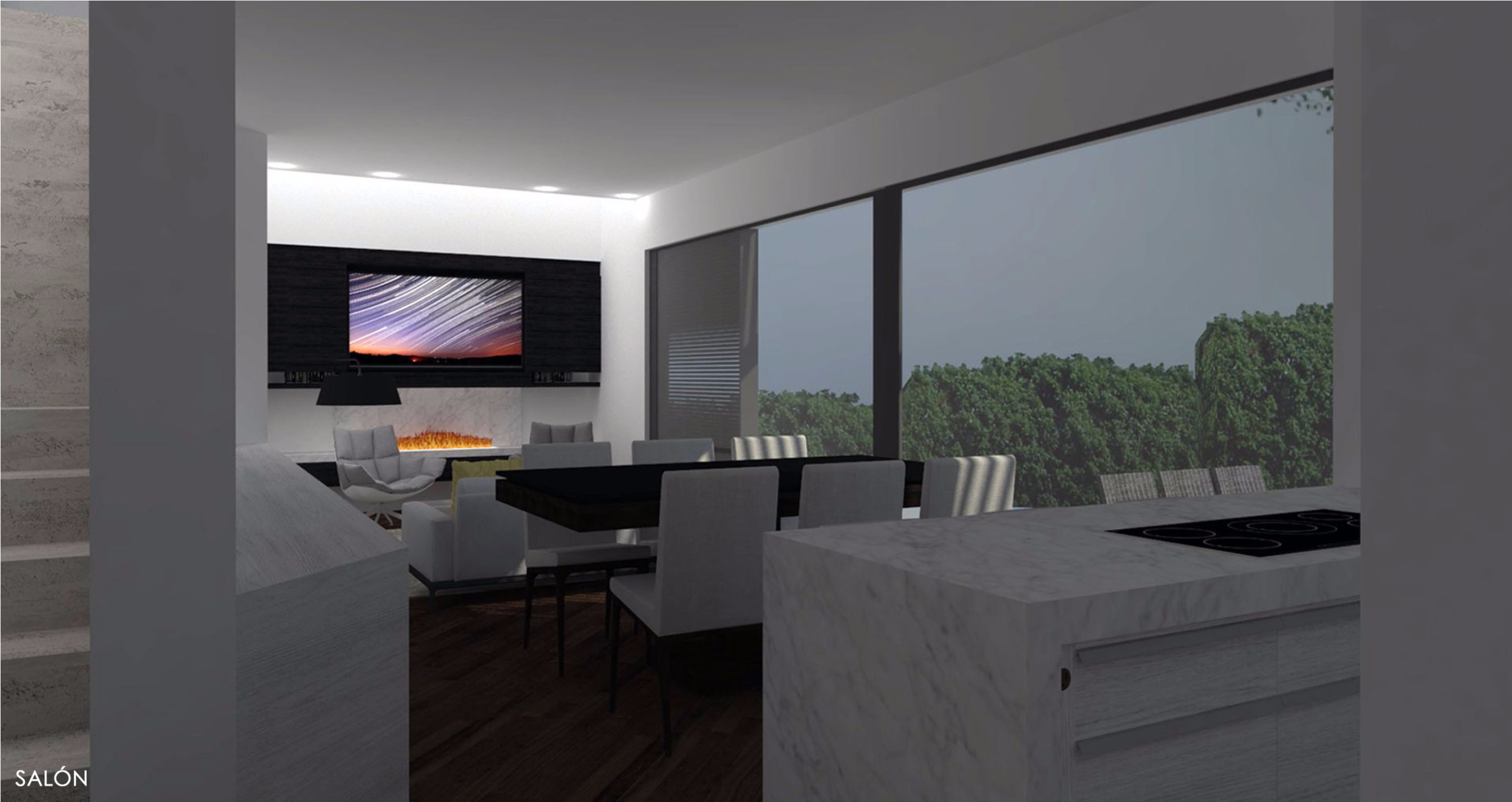 El semisótano aprovecha la pendiente y aloja una sala de televisión (con posibilidad de convertirse en habitación de invitados), zona de lavandería, cuarto de máquinas y un garaje. En la planta baja se ubica el salón-comedor, la cocina, un despacho y el jardín que cuenta con una zona de comedor exterior (anexo al salón-comedor), un salón exterior (conectado al despacho) y la piscina. En la planta piso está la habitación principal con un baño y un vestidor que se vincula visual y espacialmente y tienen comunicación con el exterior a través de una amplia terraza.