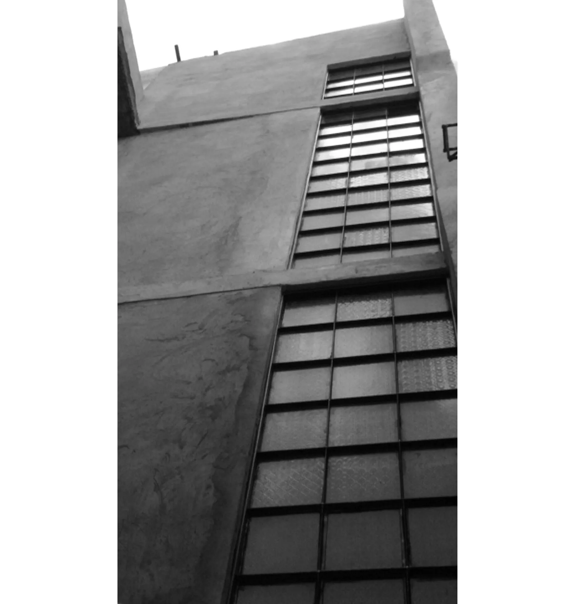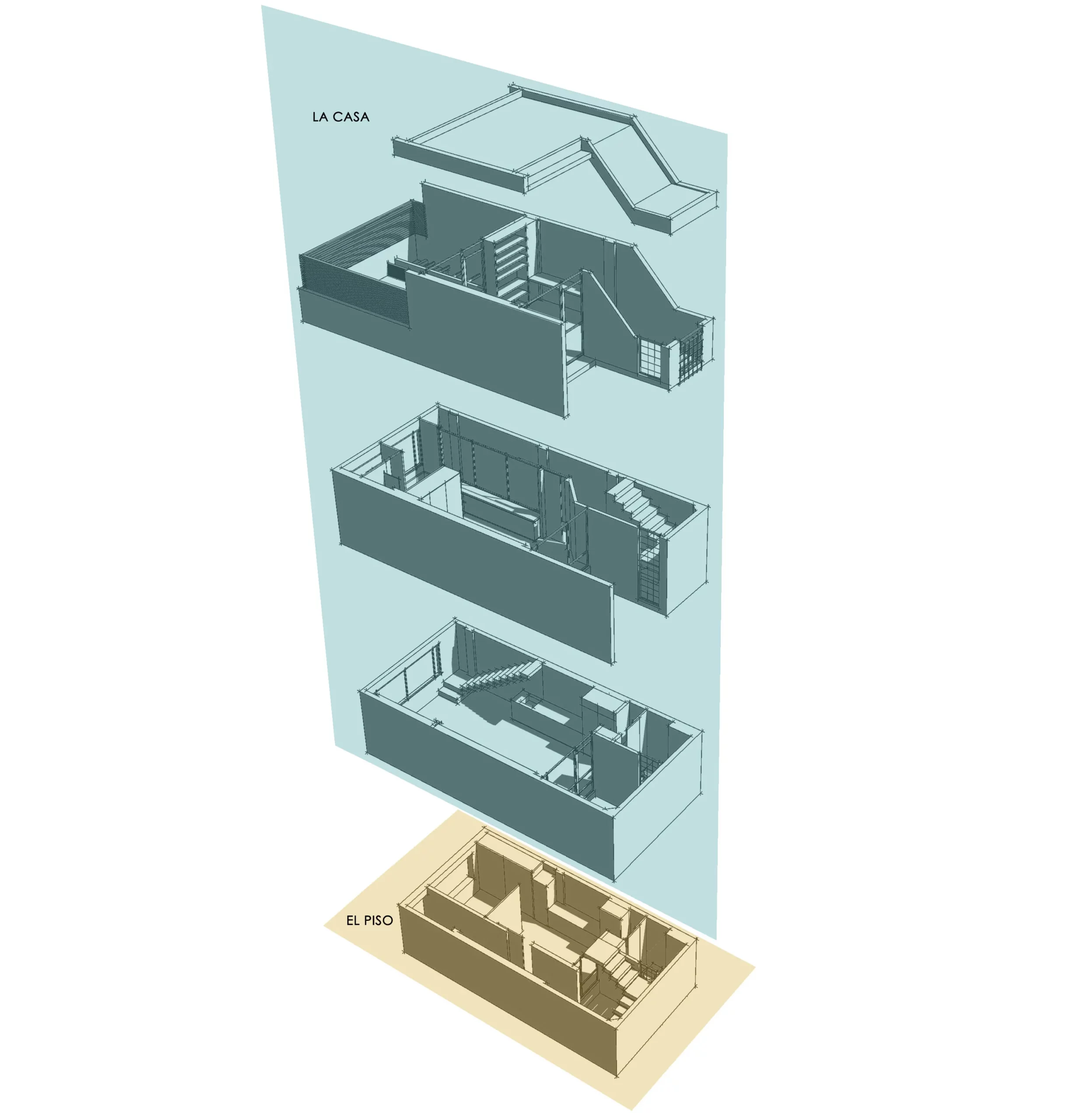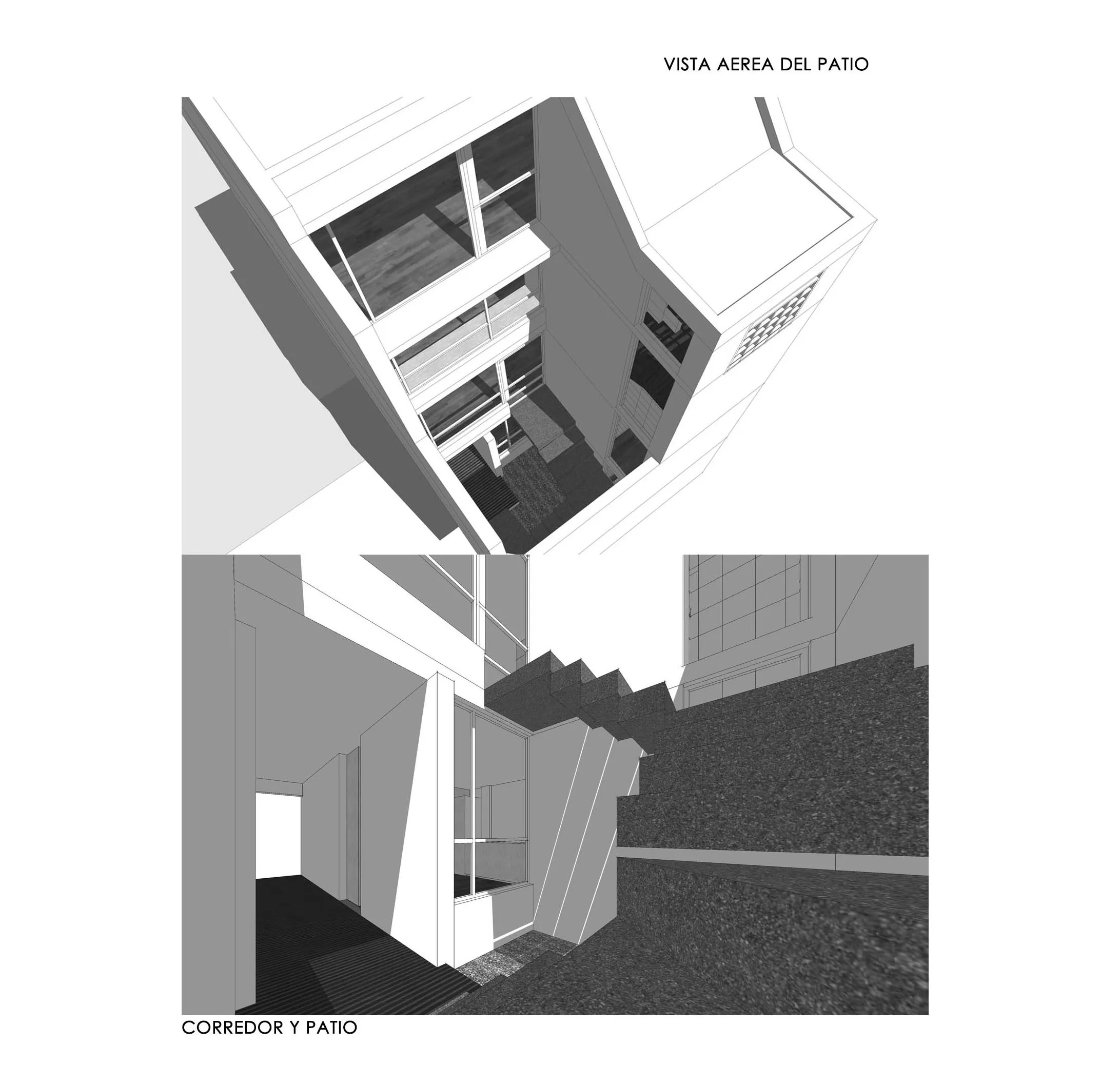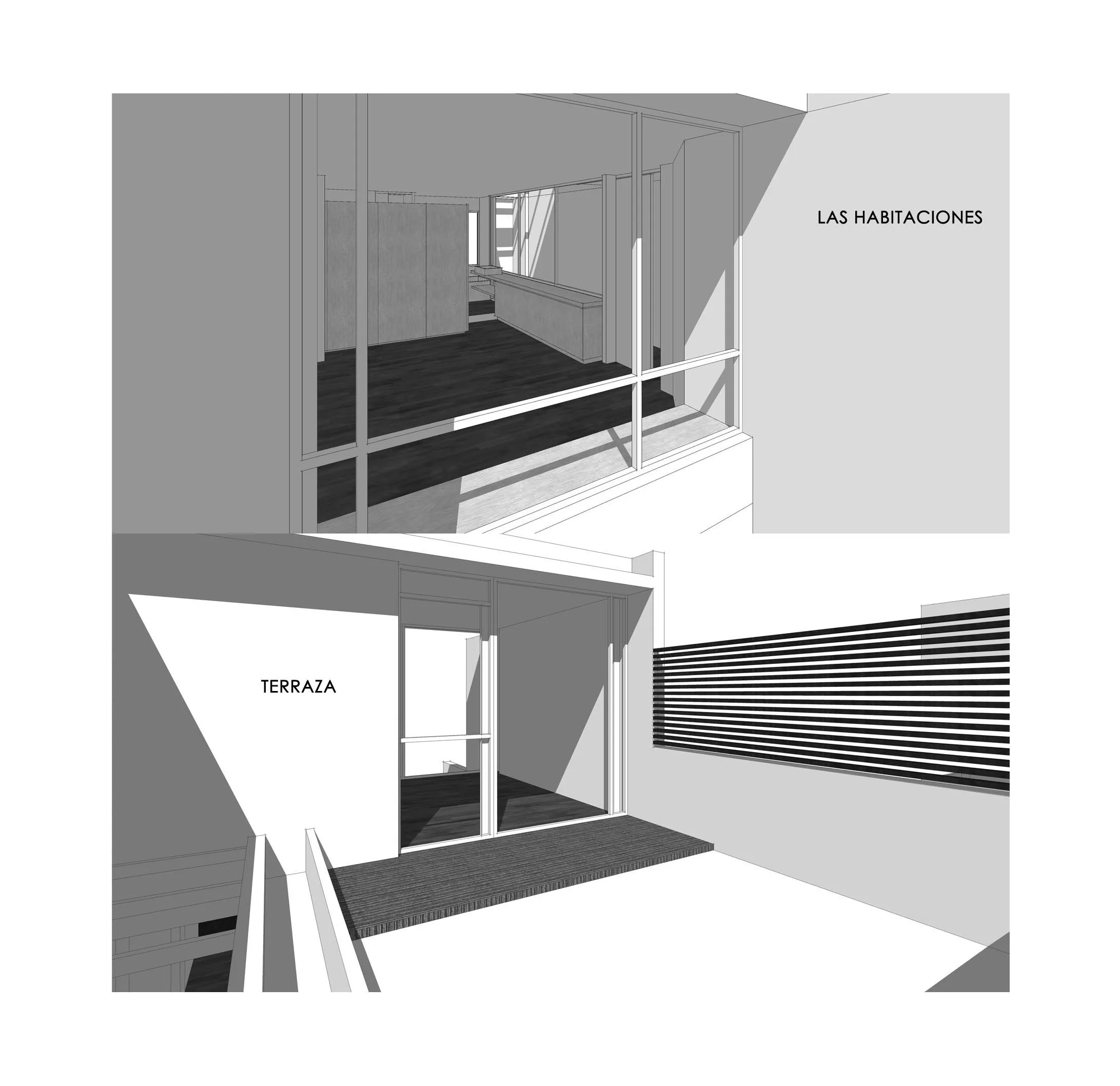El corredor de acceso y el patio, que sirve de distribuidor y en el que se ubica la escalera de acceso a la casa, constituyen los espacios comunes cuyos materiales (ladrillo, hormigón y gravilla) expresan ese carácter de lugar semi-público.