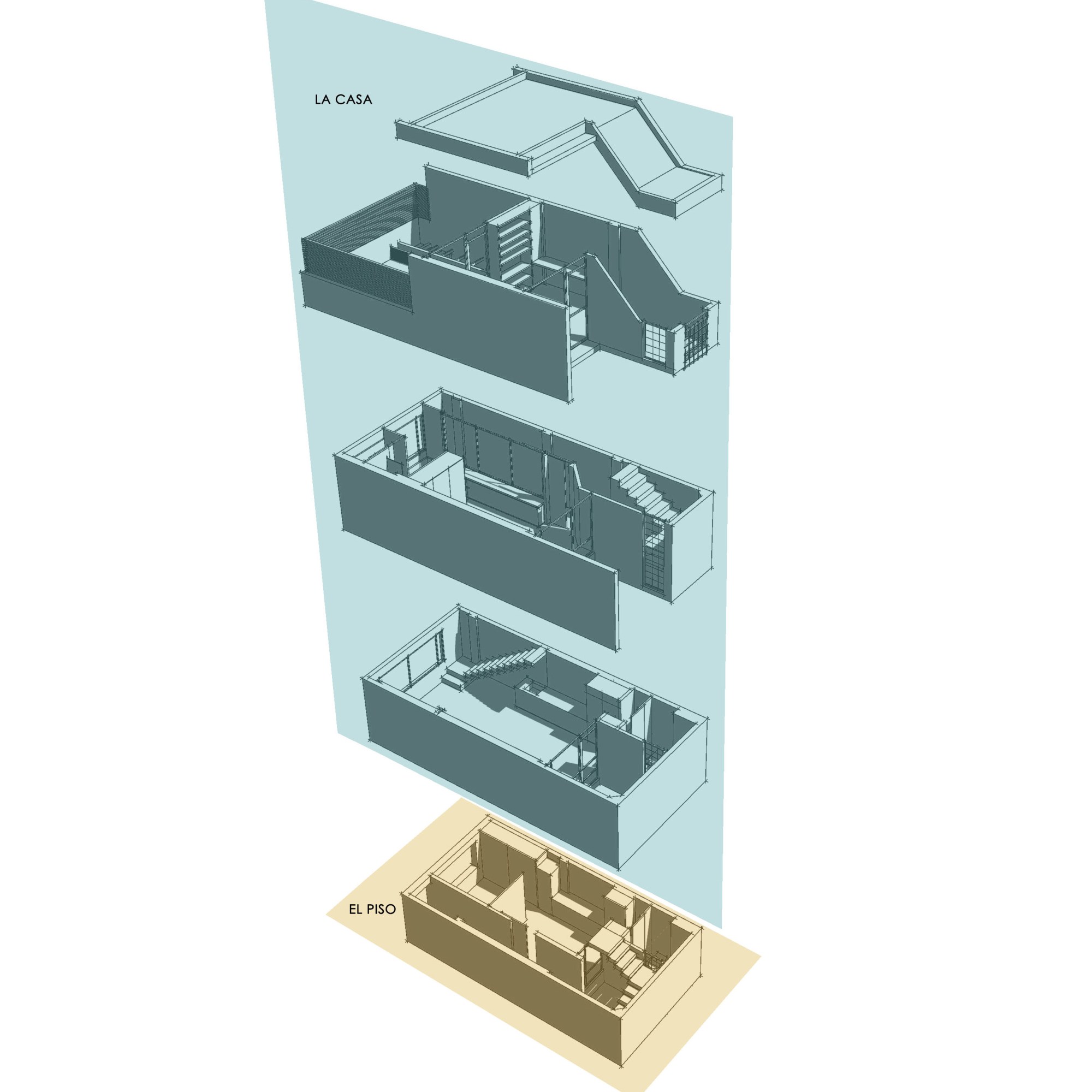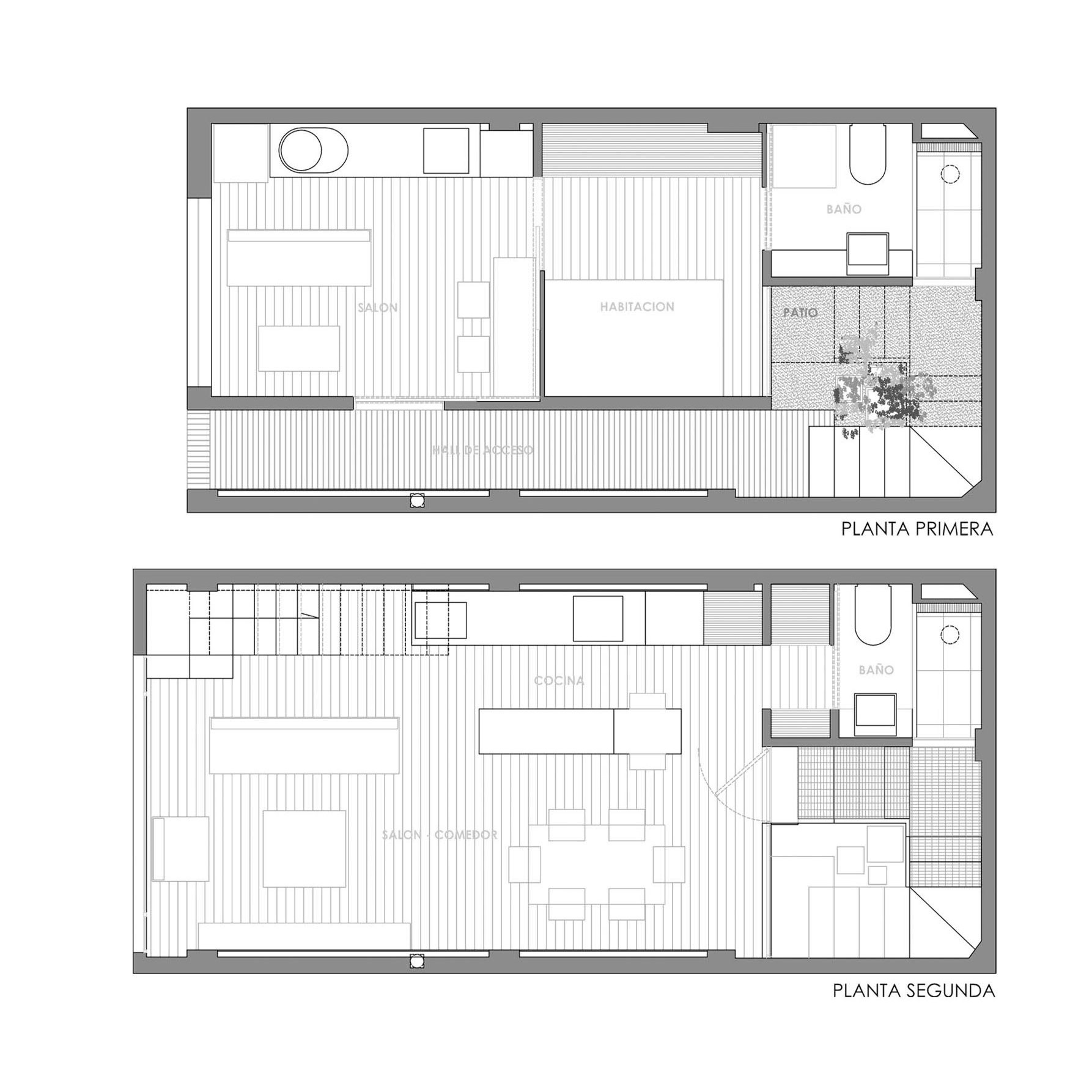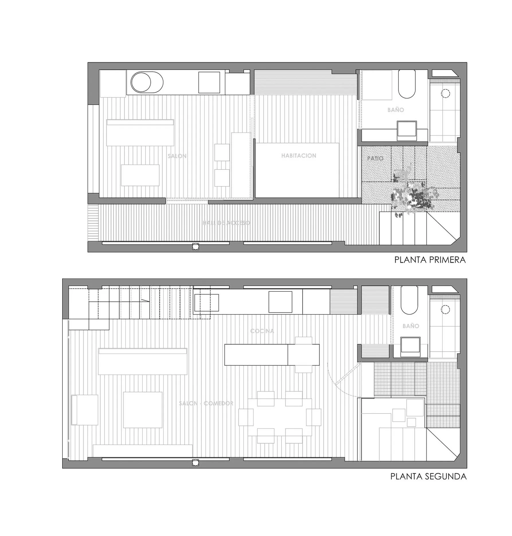En la parcela, un rectángulo de 4.5m x 9.0m, se proyecta la vivienda para una familia que quiere contar con un apartamento de alquiler en planta baja. Este cuenta con un salón-cocina orientado hacia la calle y la habitación y el baño orientados hacia el patio interior.