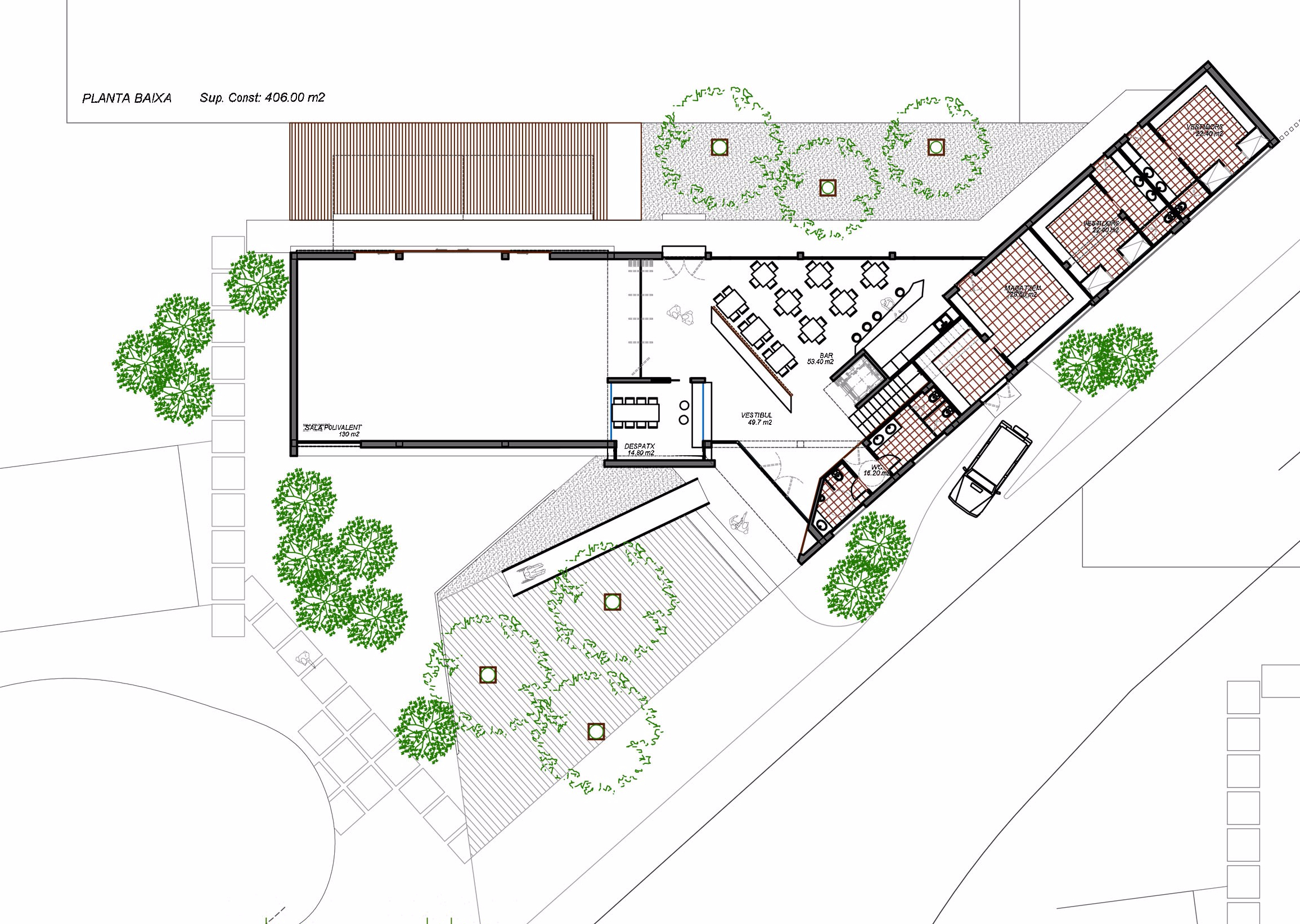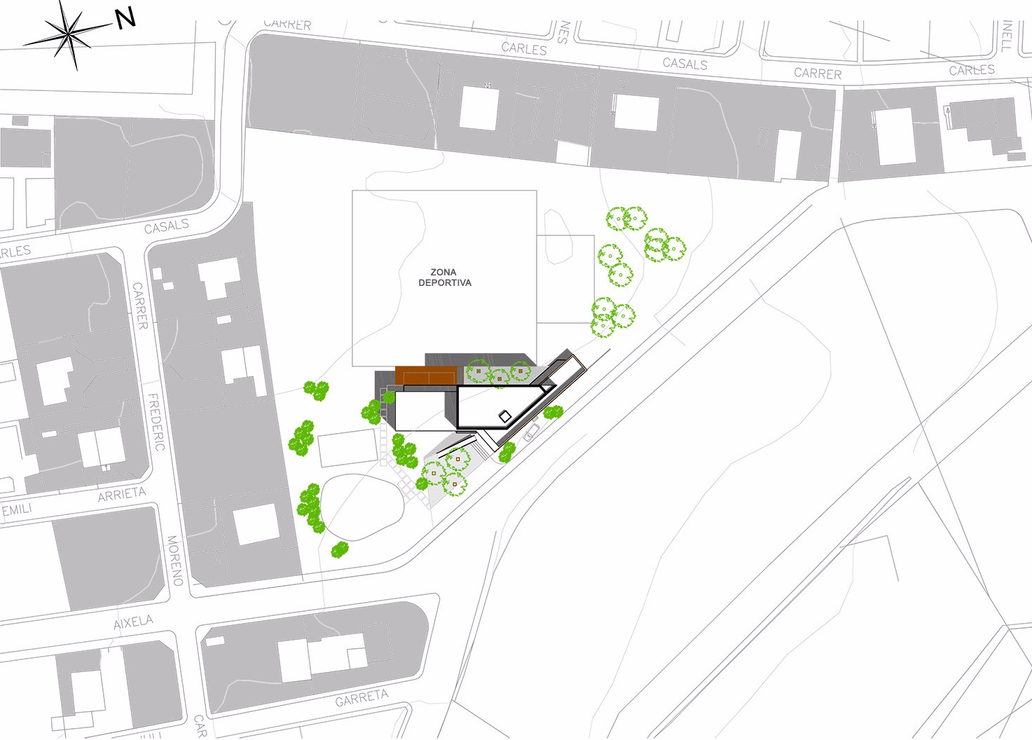 El programa funcional incluye una cafetería, vestidores deportivos, un gran salón múltiple y servicios anexos en planta baja, y una sala de descanso, un espacio susceptible de ser dividido para alojar talleres u otras actividades y una amplia terraza en la planta piso.