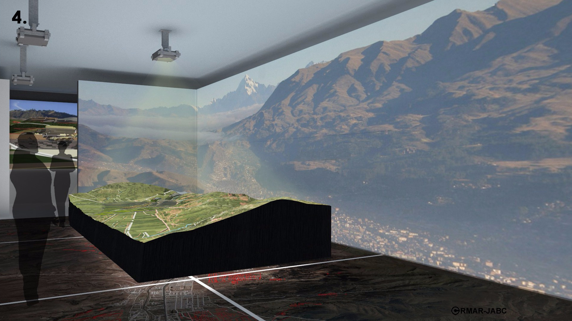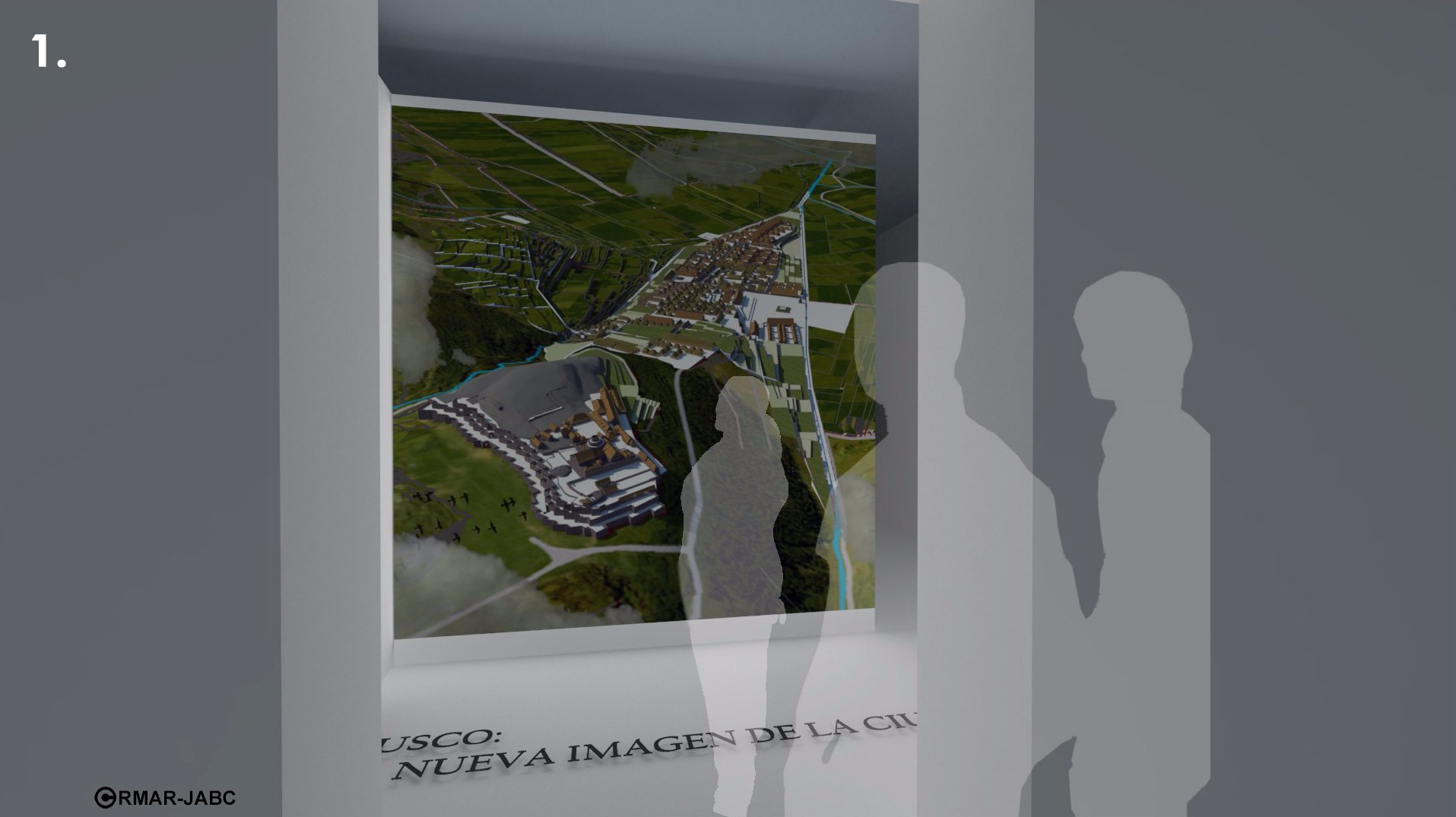 En esta línea proponemos los siguientes ámbitos espaciales de trabajo en la sala: 1. Acceso, 2. Cusco: Gran obra de ingeniería, 3. Visita virtual al cusco inka, 4. Sala de la maqueta, 5. Cómo se hizo el modelo 3D.