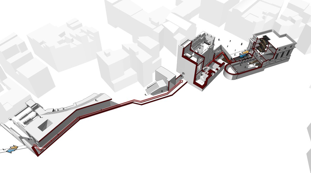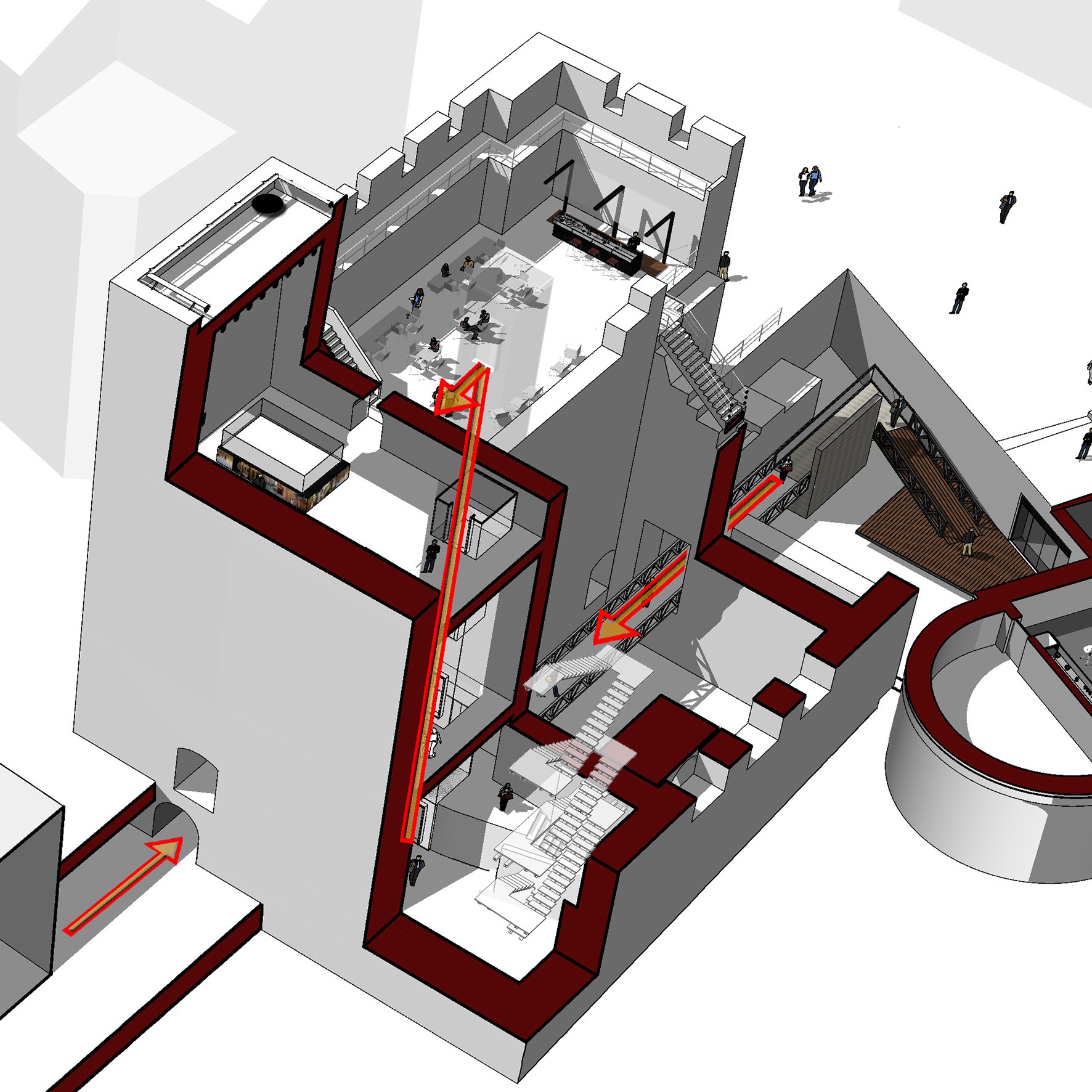 En este sentido, la primera propuesta estaba dirigida a la unificación de los recorridos, dando continuidad a los dos accesos existentes, permitiendo a través del discurso museográfico la continuidad en el relato.