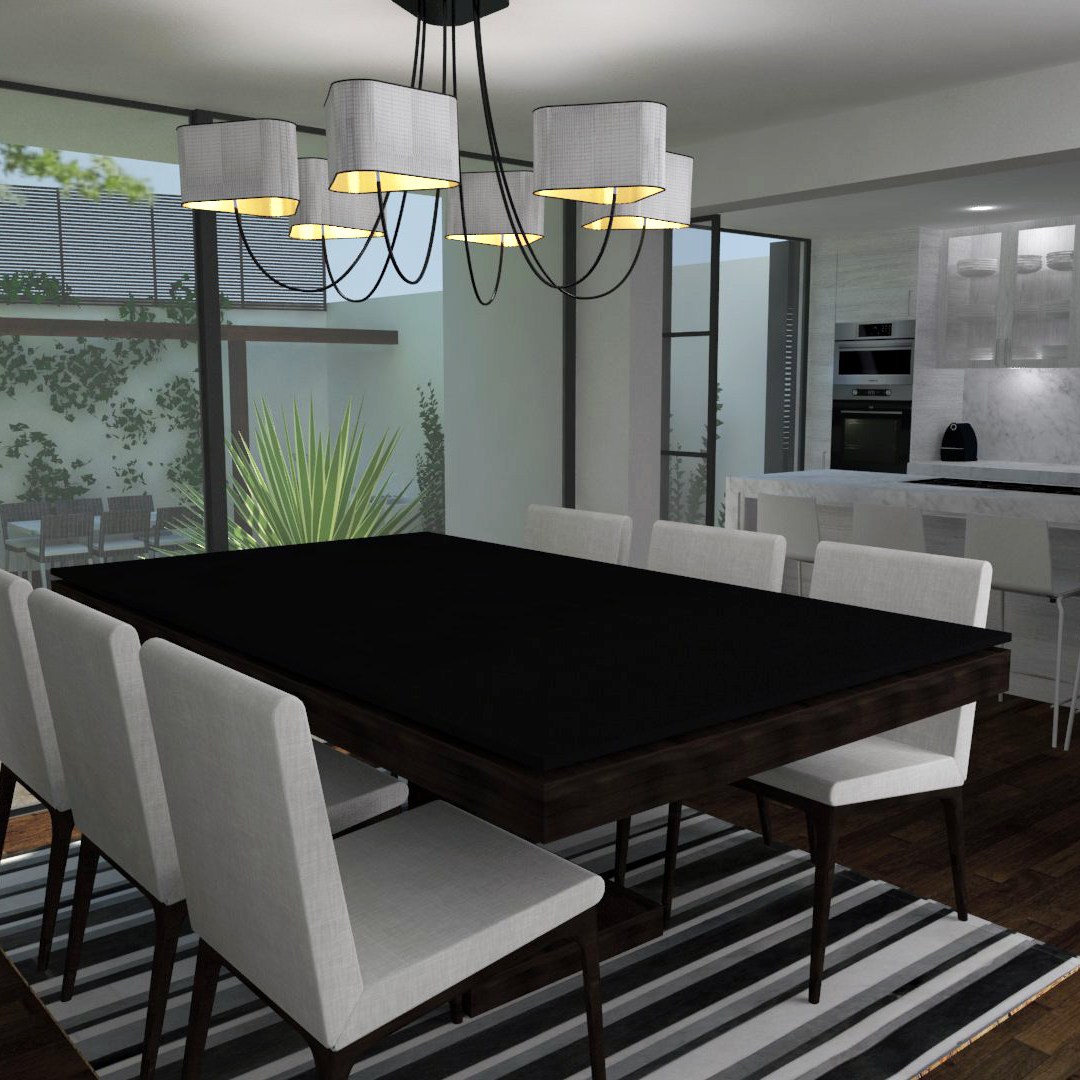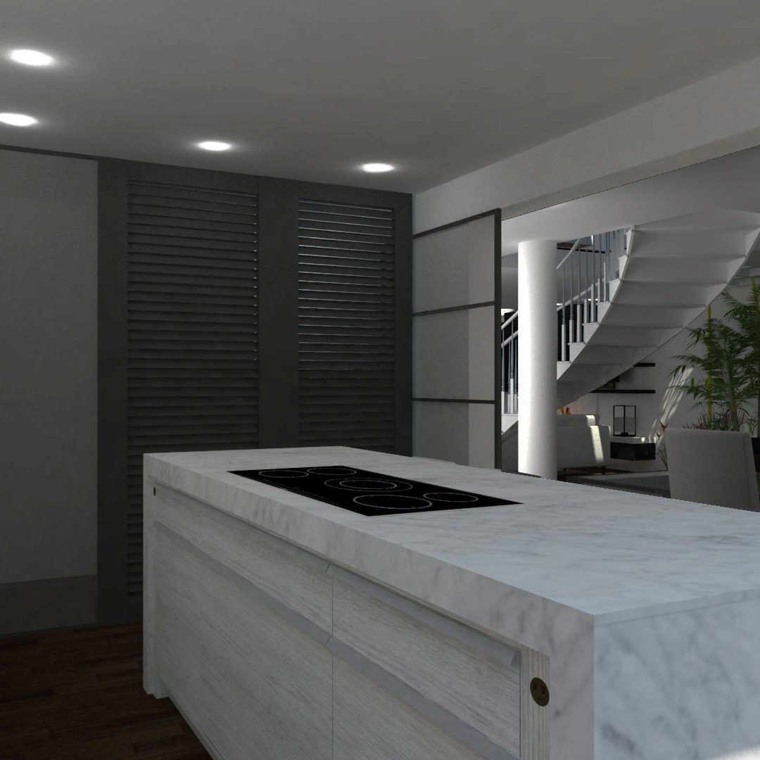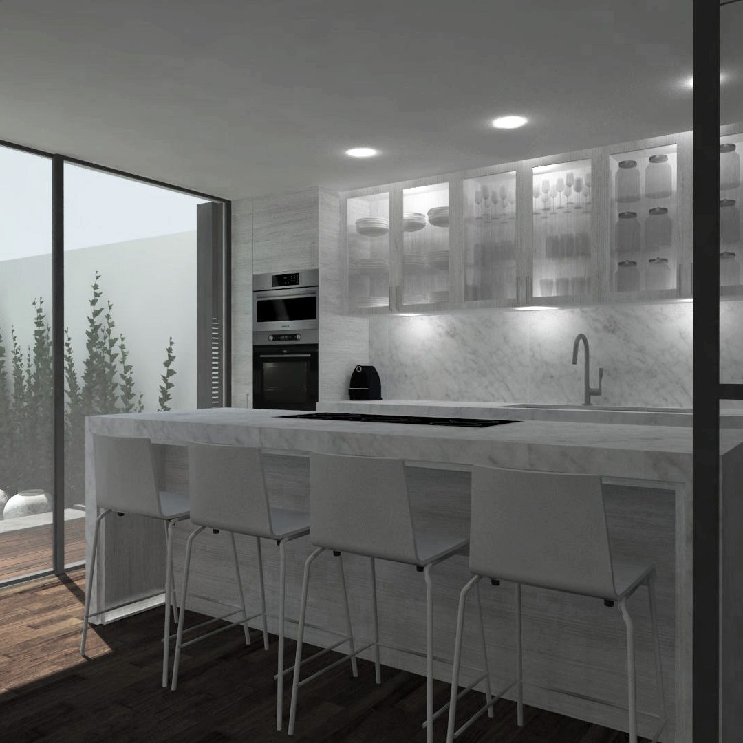 La cocina está planteada desde el punto de vista de la funcionalidad. Aunque de concepto abierto, dispone de puertas correderas de cristal que permitan cerrarla sin que pierda relación visual con el resto de la casa. En la parte posterior, se localiza la nueva zona de lavandería y el acceso desde el garaje en el semisótano.