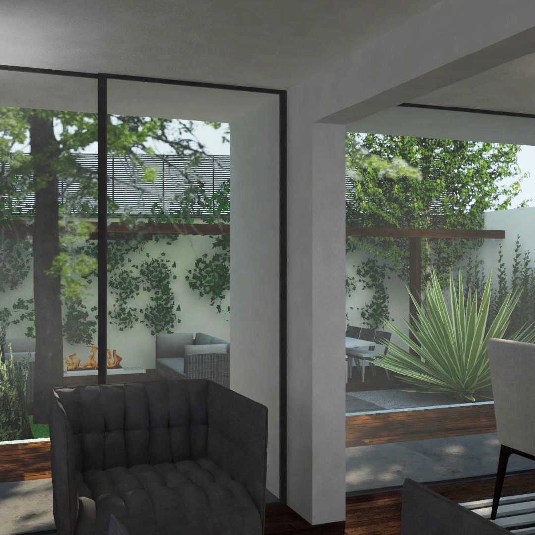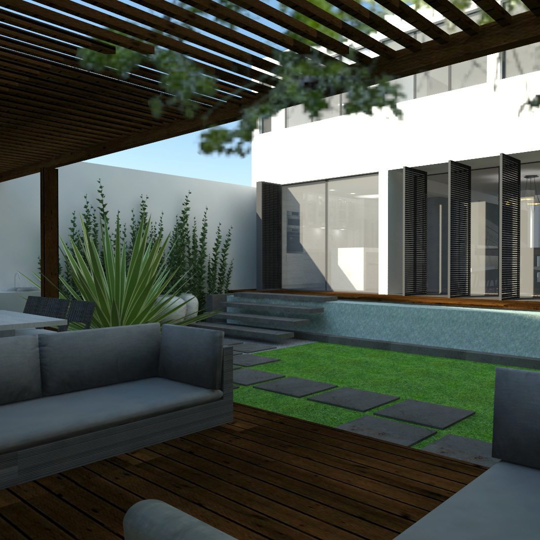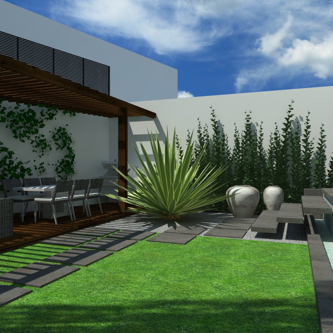 El jardín posterior se plantea como un «oasis», un lugar de descanso al aire libre. La zona de salón-comedor abierto se dispone en la parte posterior del jardín: desde la casa es el punto focal y libera un espacio de vegetación y agua.